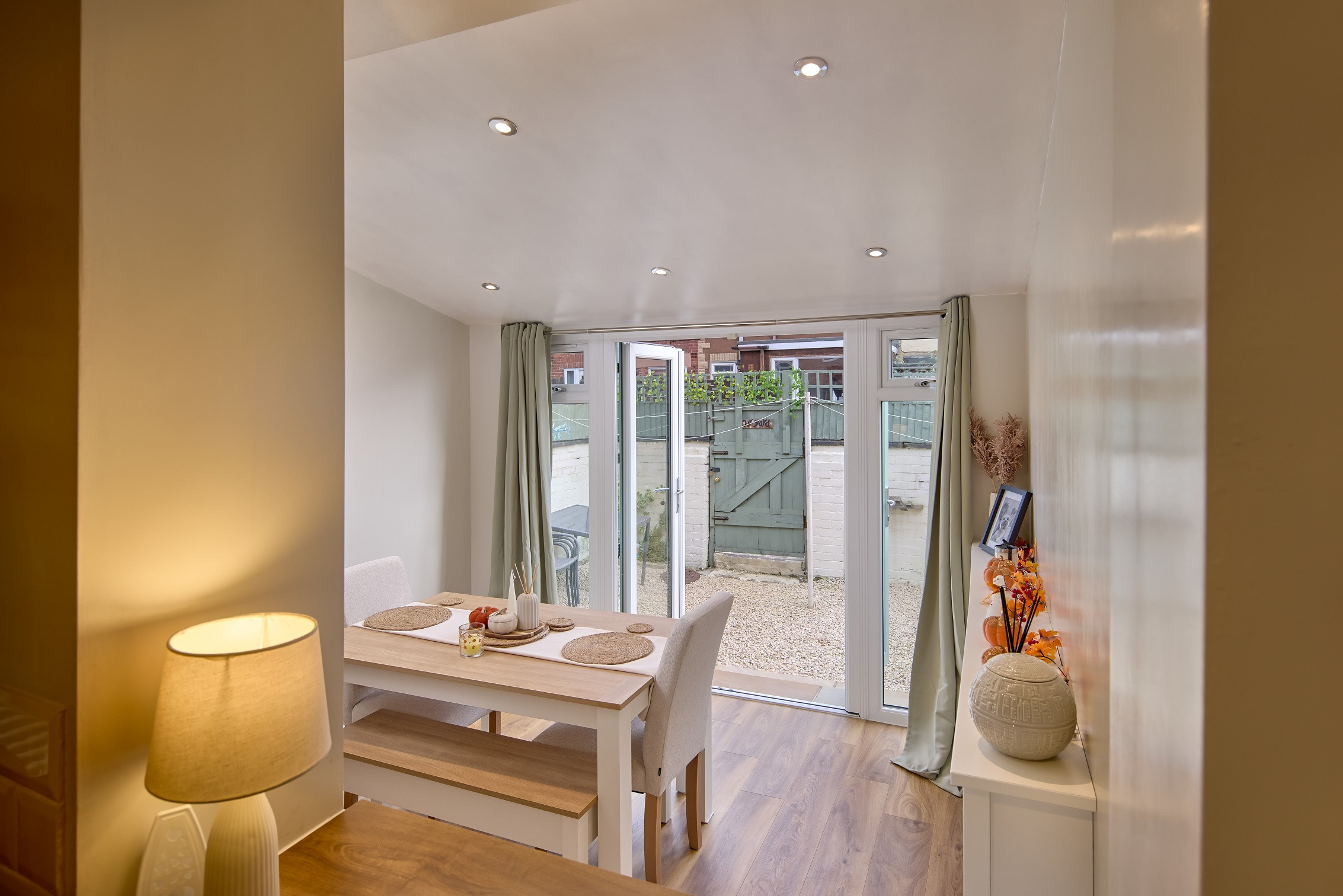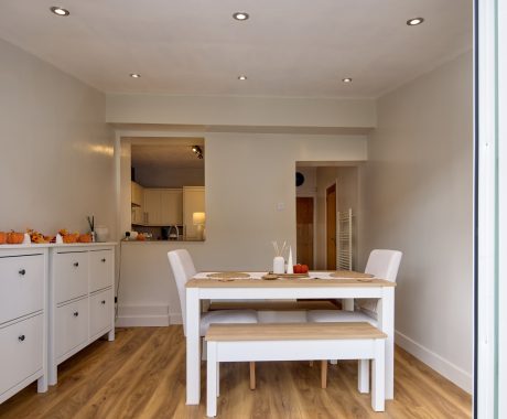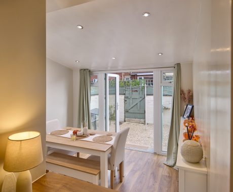 Working with our design consultant, he decided upon a beautiful Single-Storey Extension, with a Solid Tiled Roof and Chartwell Green French Doors.