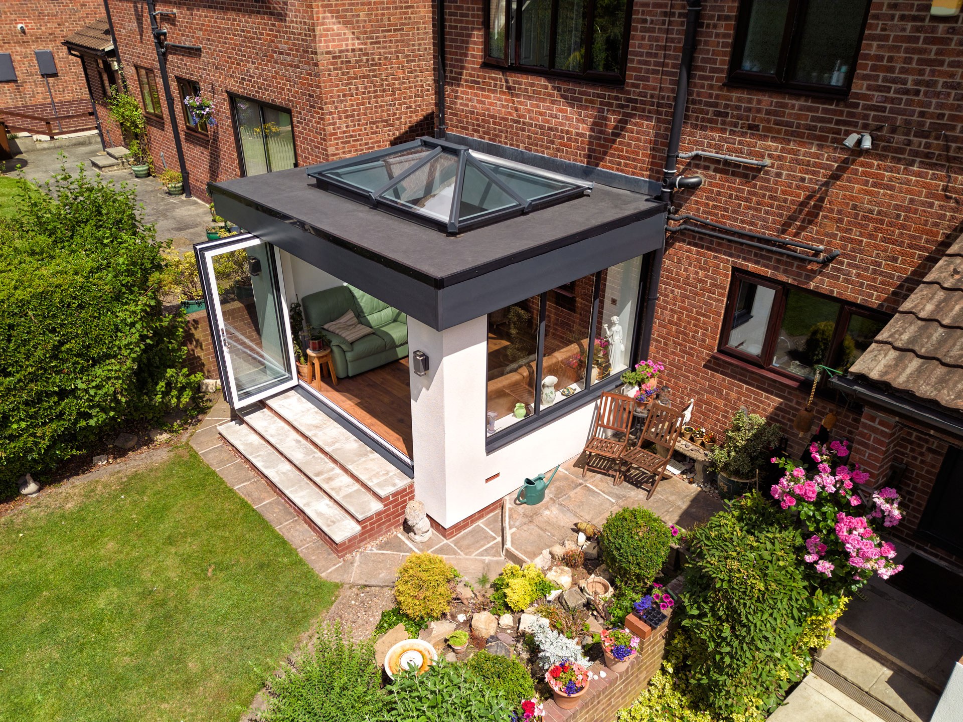 They opted for a 4000mm x 3000mm orangery with anthracite grey frames, chrome ancillaries, LED lights, orangery roof with neutral glass and a three-pane aluminium bifold door. To achieve the desired look our specialist fitting team removed the existing brickwork, squared off the existing base and built three easily accessible steps up to the opening of the new orangery. The new orangery was then rendered to add the perfect finishing touch.